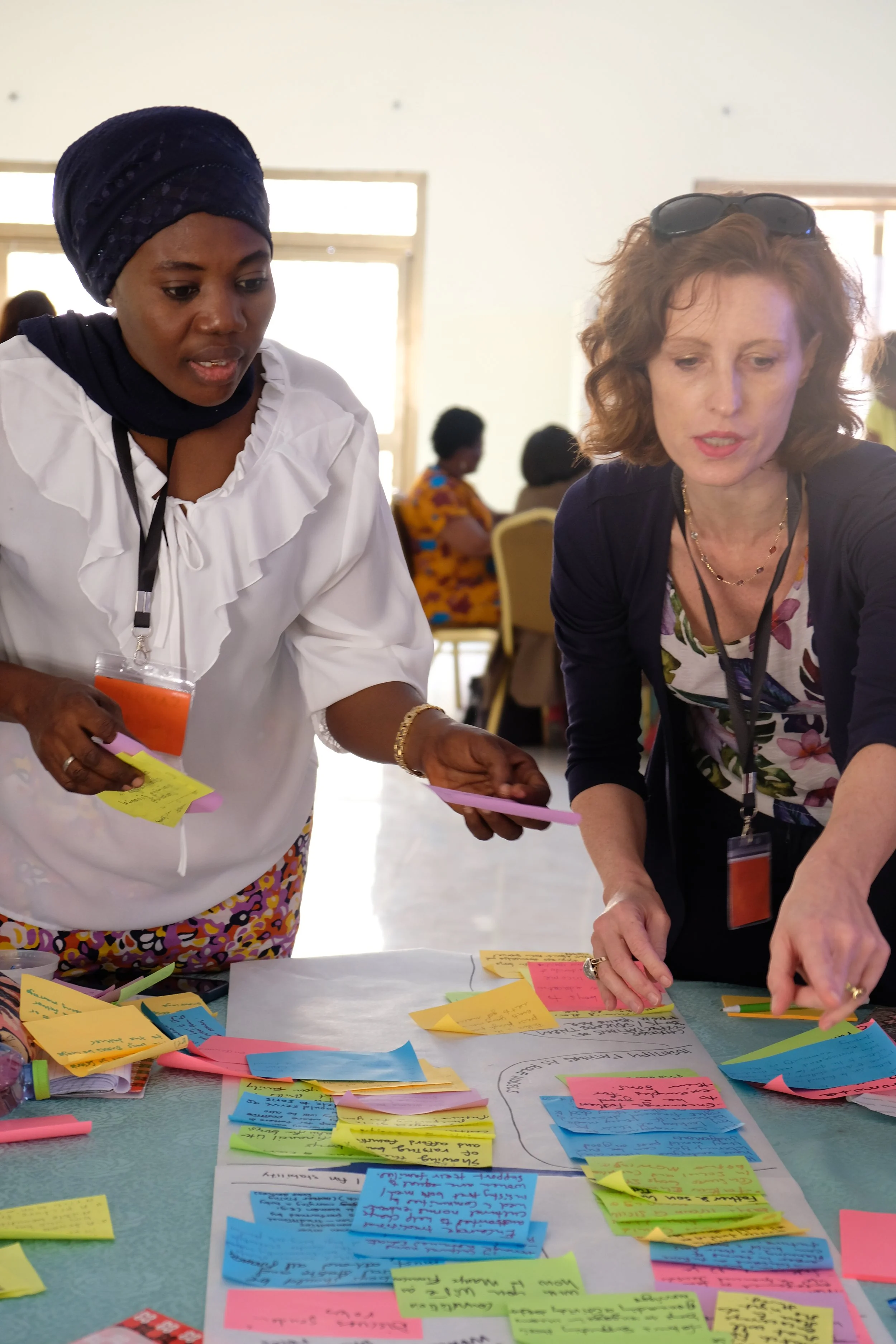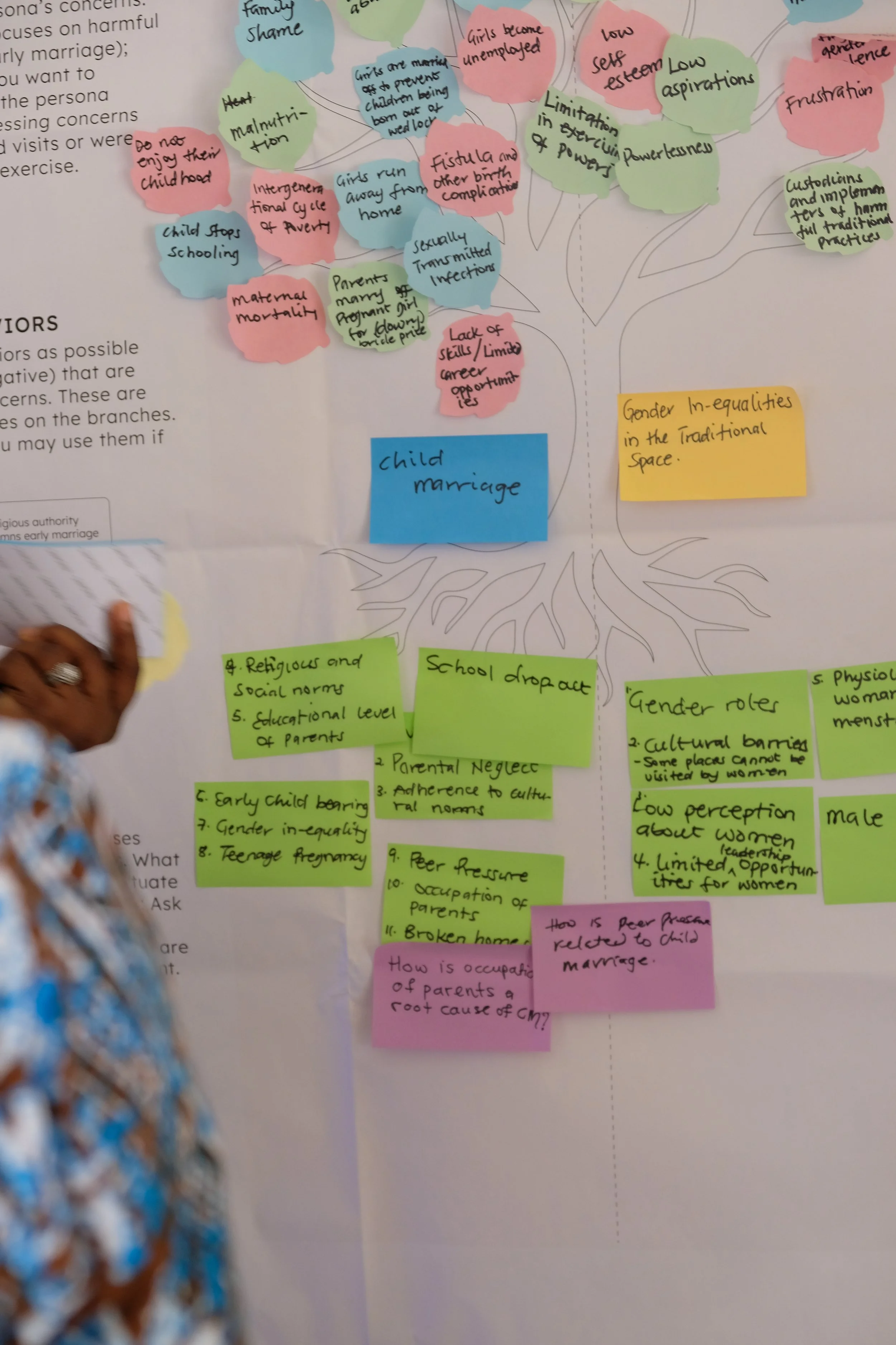 Workshops included 3 days of learning and 2 field visits. Left: Hacking the classic problem tree to identify drivers behind FGM and/org child marriage next to the issues the community finds most pressing. Right: After field research, creative prompts are developed in response to key barriers to address. Participants go through an idea generation sprint, generating 100s of solutions in under an hour before prioritizing concepts for prototyping and testing with community members.